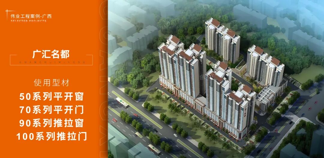 廣匯名都作為廣匯集團(tuán)首筑江南,禮獻(xiàn)南寧的作品,項(xiàng)目選用偉業(yè)集團(tuán)50系列平開窗、70系列平開門、90系列推拉窗、100系列推拉門系列型材,以品質(zhì)建筑要求革新人居生活。