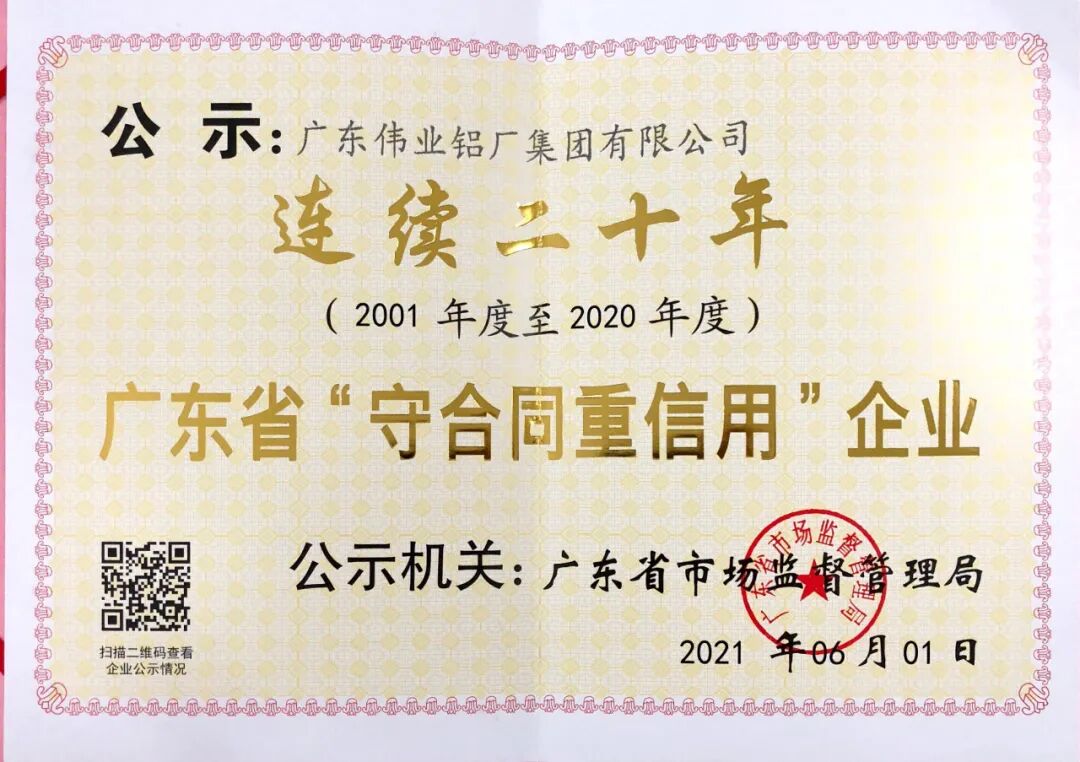 獲得由廣東省市場(chǎng)監(jiān)督管理局頒發(fā)的廣東省“守合同重信用 ”企業(yè)稱號(hào)。偉業(yè)集團(tuán)已連續(xù)二十年,